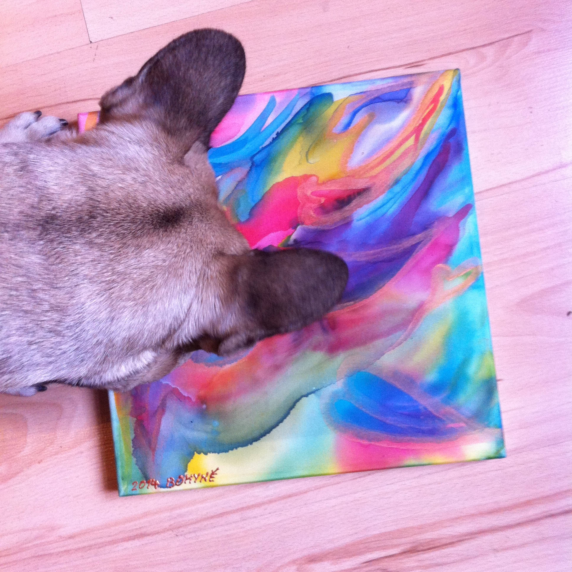 Setkání v našem podání ovšem vypadalo asi tak, že jsem čekala u Technického Muzea, on se přiřítil ve svém bouráku, já naskočila i se psem (Hey, Fergus! How R U, my friend? Yeah!) a pak se snažila na něj nevrhnout (na Mr.A., ne na Ferguse)…celou tu dlooooouhou cestu (cca 7minut) do Dejvic, kde mě zase vysadil, protože mi začínal kurz a jemu nějaké školení na severu. I tak jsem ho stihla slyšet, vidět a políbit. A to všechno v těch 7 minutách. A pak už jsem v psím outfitu makala na ten inkriminovaný kurz malby na hedvábí. S výčitkama, že na mě dalších sedm lidí čeká. Samozřejmě jsem dokonale multifunkční, takže jsem v běhu psala z téměř vybitého mobilu sms o tom, ať začnou beze mně a jak mě to mrzí.