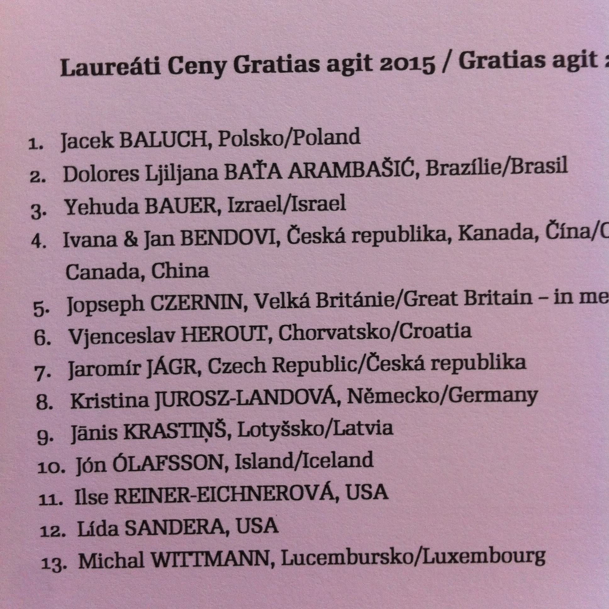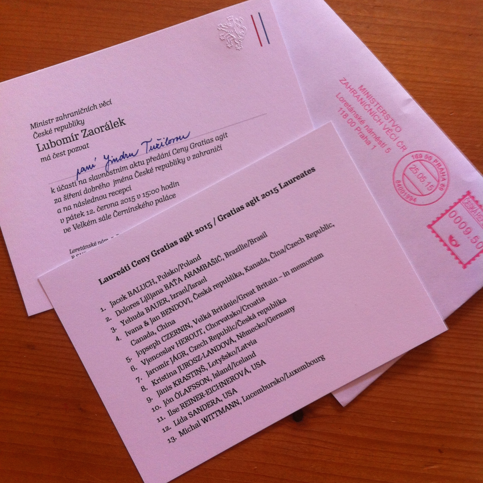 Nicméně o pár dní další „zajímavost“ přišla poštou. Byla to pozvánka na předávání cen Gratias Agit 2015. Tohle je cena pro